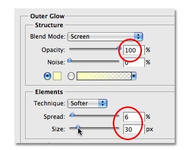 افزایش opacity تا ۱۰۰٪. سپس، در بخش elements از گزینه ها، افزایش spread به حدود ۶٪ و size به حدود ۳۰ پیکسل: