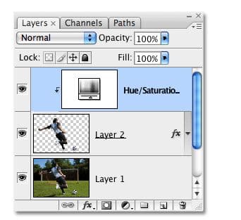 اثر طرح اصلی در حال حاضر کامل است، اما اجازه دهید آن Hue / saturation دهیم . ما می خواهیم مطمئن شویم ، هر چند، که لایه تنظیم ما تنها به موضوع اصلی، نه تمام تصویر تاثیر می گذارد، بنابراین به “لایه ۲” می رویم ، که لایه حاوی موضوع اصلی ما است . کلیک بر روی آیکون تنظیم جدید لایه در پایین پالت لایه ها. Hue / saturation را از لیست انتخاب کنید: