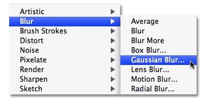 “Layer 1” در پالت لایه ها کلیک کنید تا انتخاب شود . ما قصد داریم بقیه عکس را تیره کنیم ، و برای انجام این کار، ما از فیلتر Gaussian Blur استفاده می کنیم . به منوی فیلتر در بالای صفحه نمایش، blur را انتخاب کنید، و سپس Gaussian Blur را انتخاب کنید: