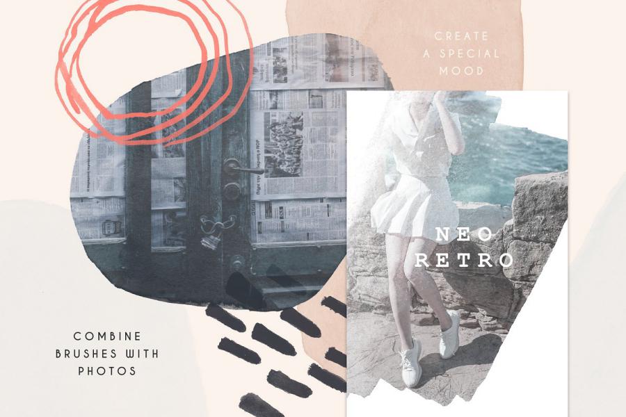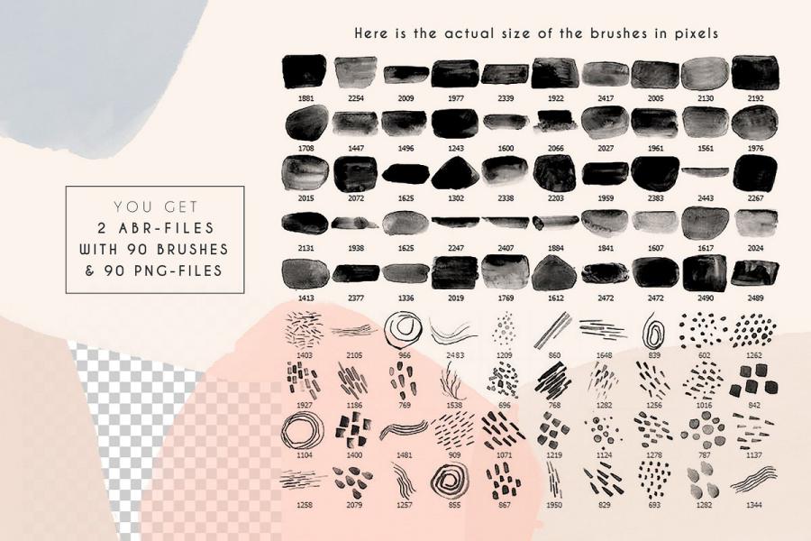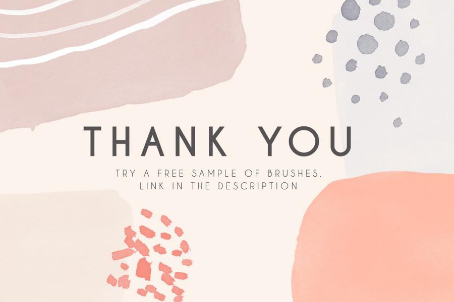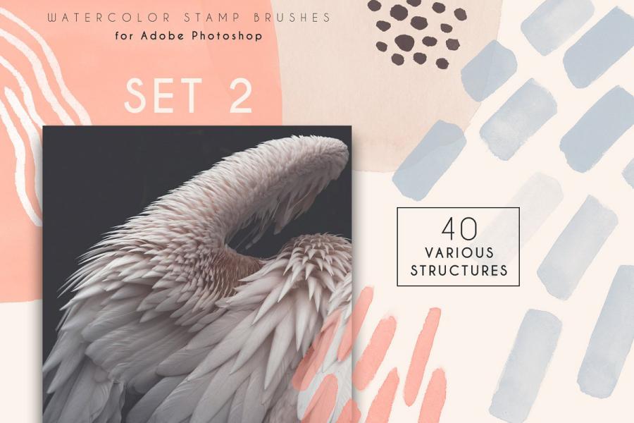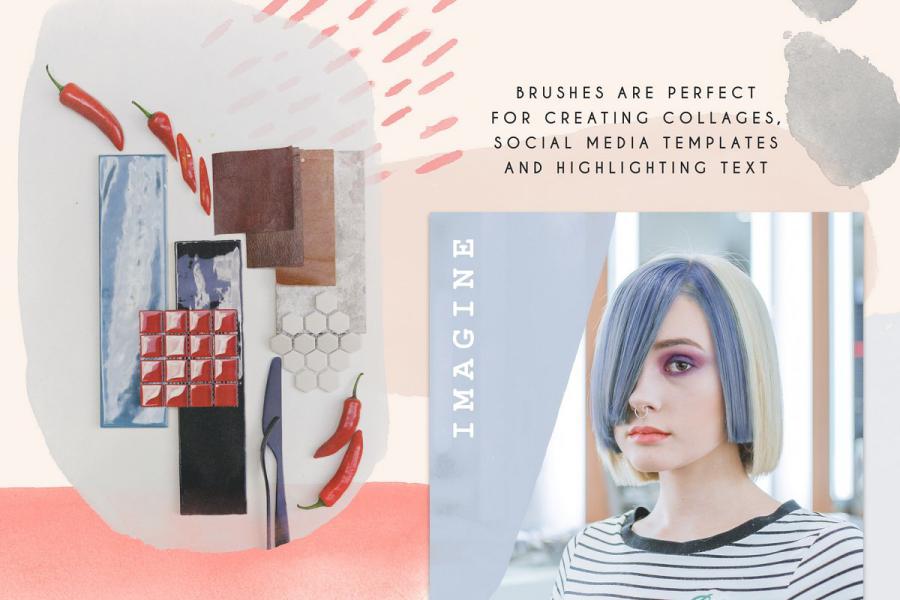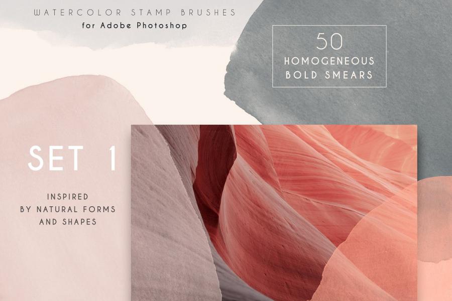Here is a collection of modern stamp brushes for Photoshop – Clarity. This is a set of bold watercolor smears and abstract structures. Each brush has an authentic watercolor texture and small hand-painted imperfections. You can easily change the size, color, blending mode and rotation of brushes. Wide strokes and small structures are perfectly combined with each other. Brushes are suitable for printing products, branding, packaging and social media design.