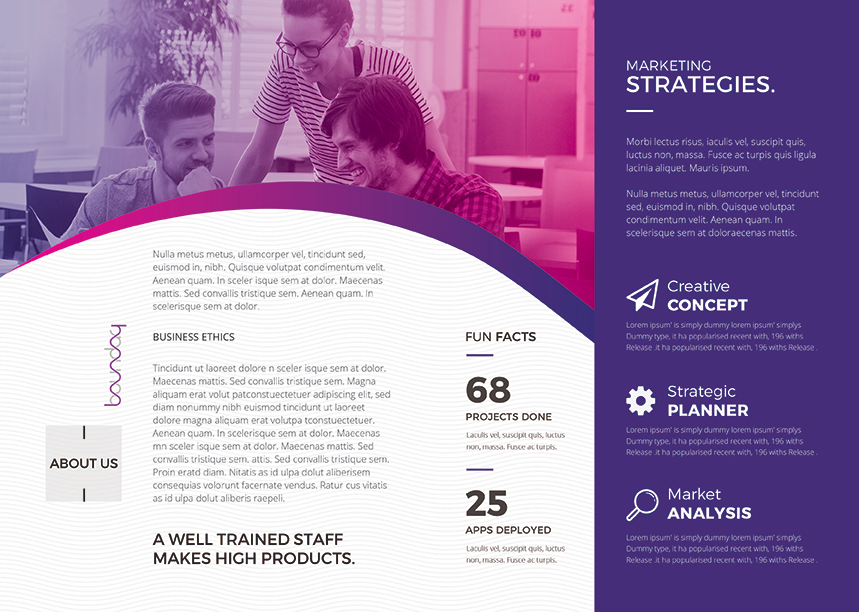 این بروشور که در رنگ بنفش و صورتی کار شده است دارای بخش های مختلفی می باشد که شما اطلاعات کامل شرکت خود را در آن جای بدهید.