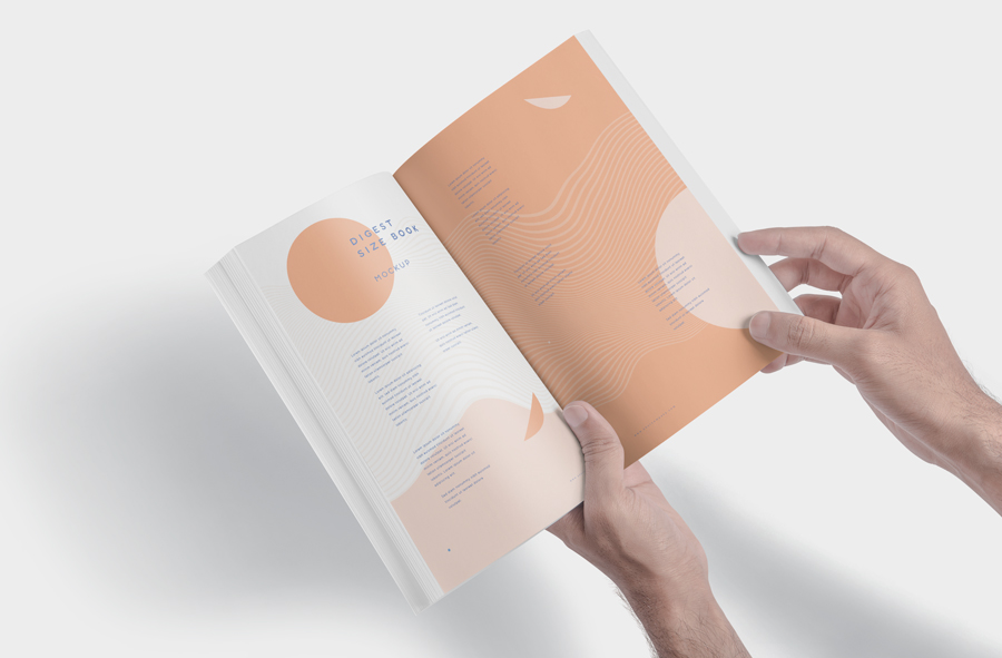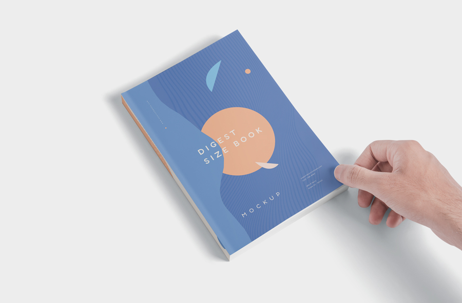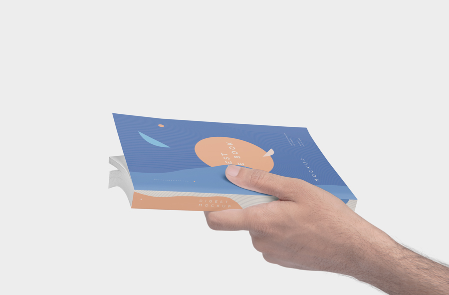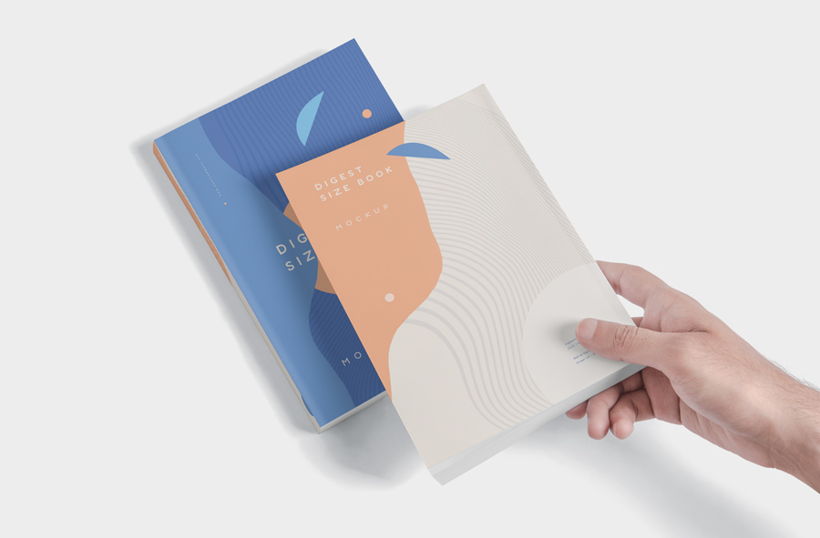 These digest size book mockups will help you showcase your paper back and inner page designs in a professional way. Offering 6 different angles with handheld positions. Just use smart object option for design replacement and well-managed layers for the customization of shadows, effects and background.