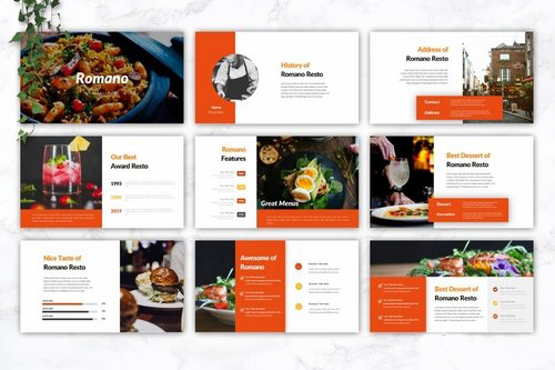 وقتی که میخواهید بیوگرافی رستوران خود را برای جایی ارائه دهید احتیاج به یک پاورپوینت بسیار جذاب و شیک با اطلاعات کامل دارید. این پاورپوینت آماده رومانو که برای دانلود در ایران جی اف ایکس قرار گرفته است به شما در ساخت یک پاورپوینت کامل برای رستوران و فست فود کمک می کند.