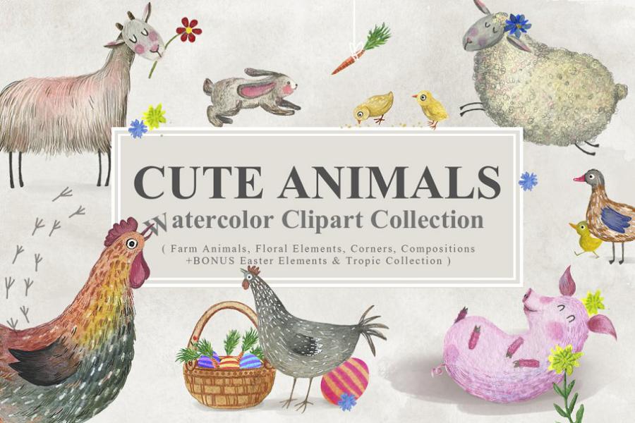 This is the collection of watercolor cute animals with corners and central compositions.