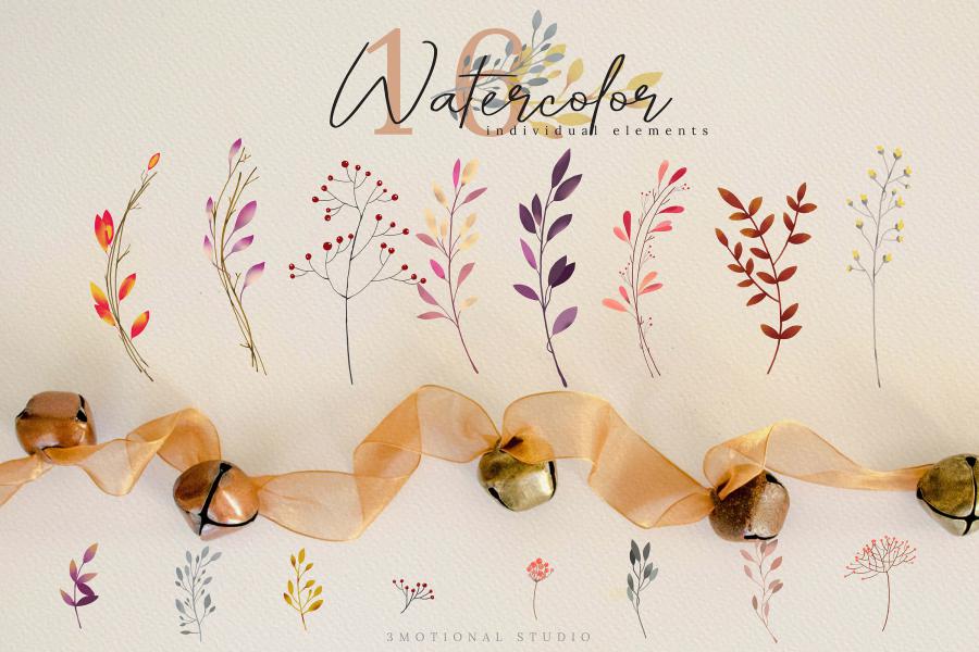 ۵۳ WATERCOLOR ILLUSTRATIONS (PNG): ready to use element graphics with transparent backgrounds – 3600 x 3600 px – 300 dpi (change the color using hue/saturation slider in PS):