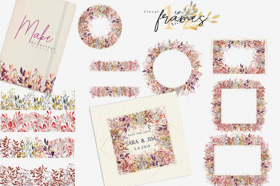 A collection of 53 Watercolor illustrations; frames drawn in png and jpg (Adobe Photoshop) formats.