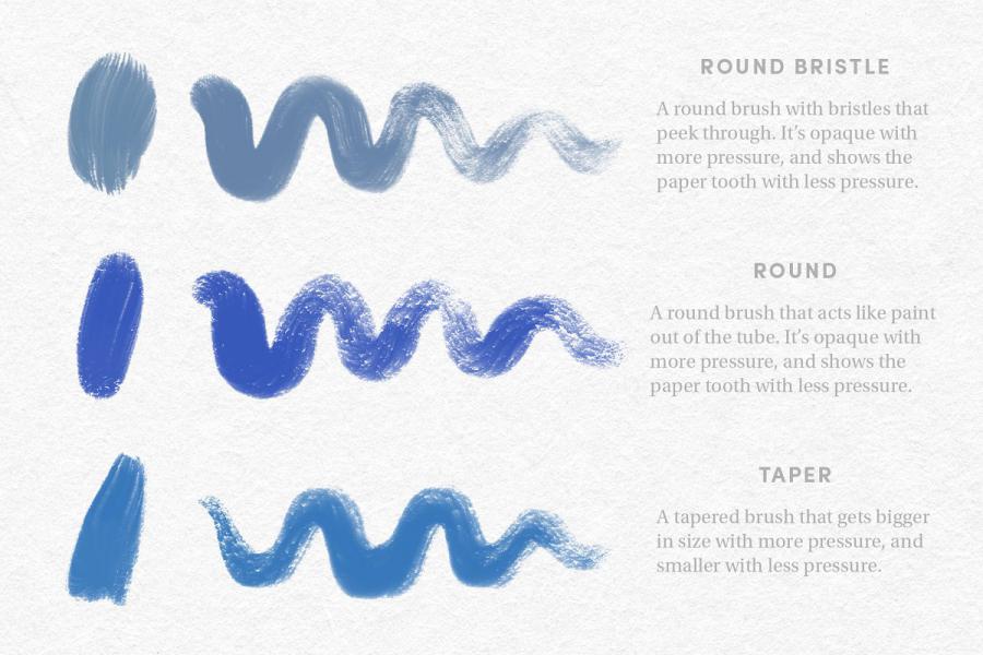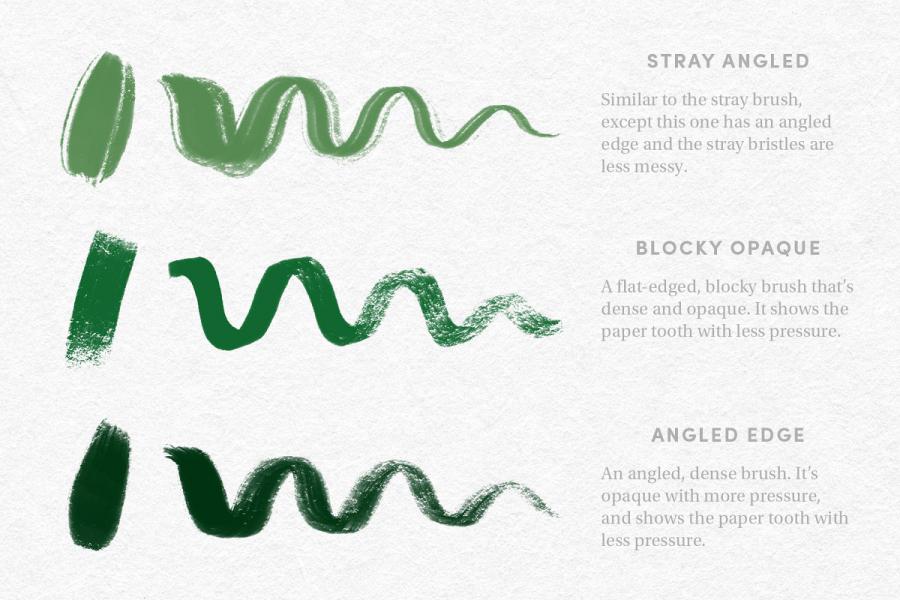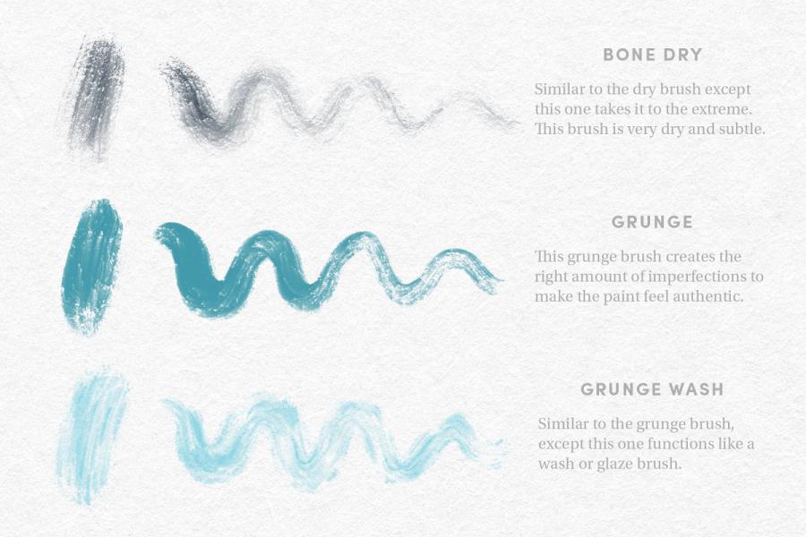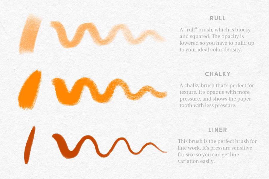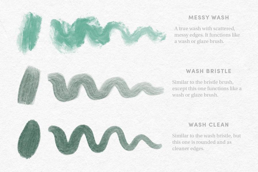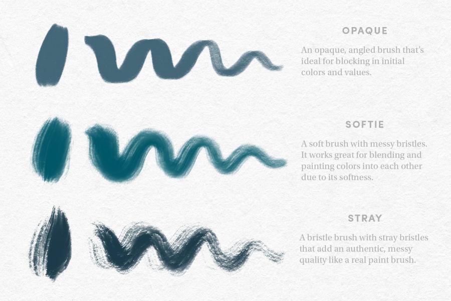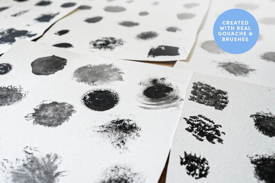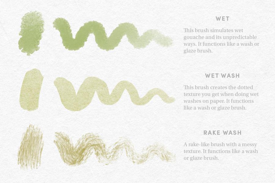 The Gouache Set features 37 custom brushes that were handmade using real gouache and paint brushes and then scanned in at a high resolution for an authentic look and feel. These brushes were designed to emulate gouache on watercolor paper. A seamless, hi-res watercolor paper was used for the texture to ensure perfect brush strokes every time. The Gouache Set includes a variety of brushes that represent gouache in its many forms, from a dense opaque brush to a watery wash and everything in between.