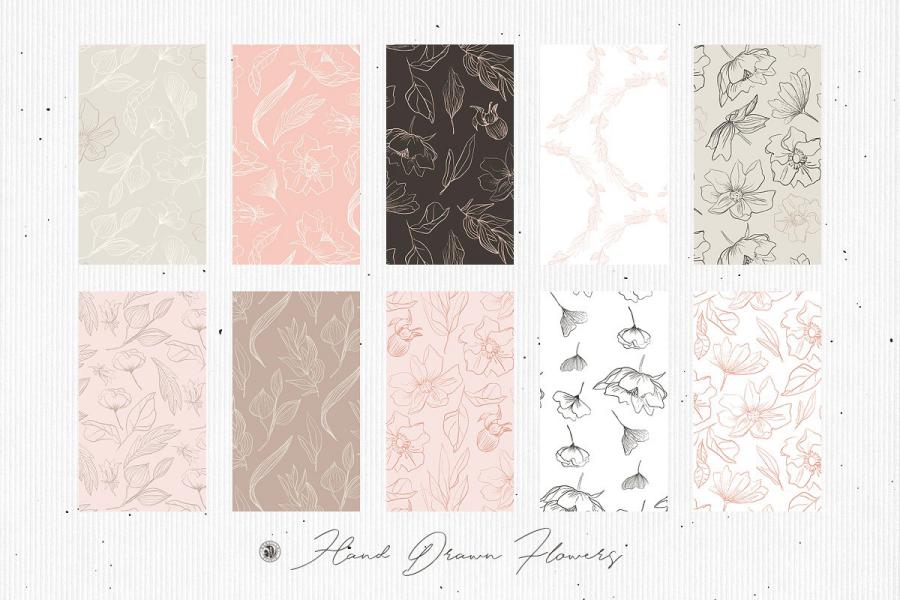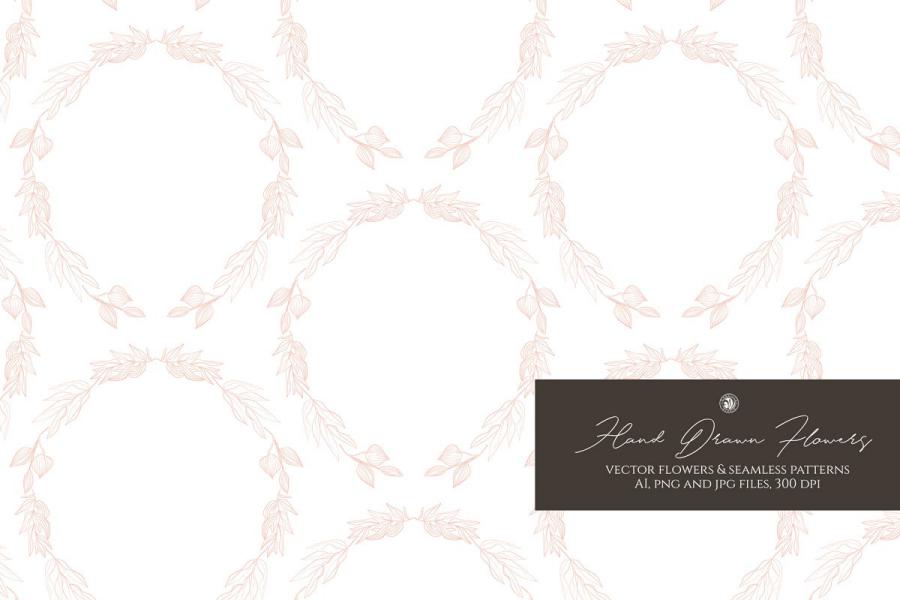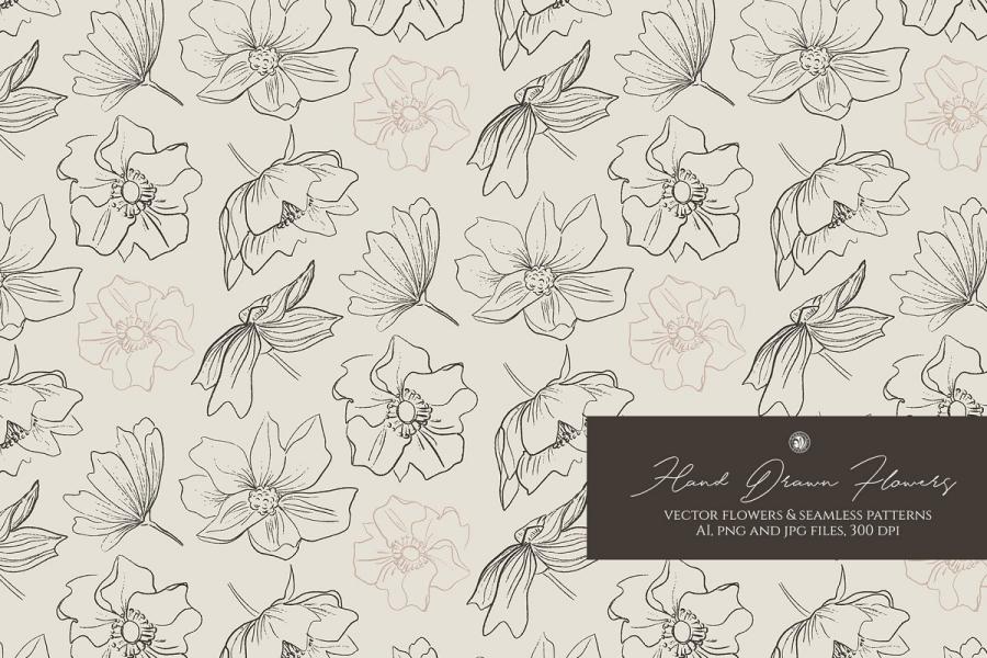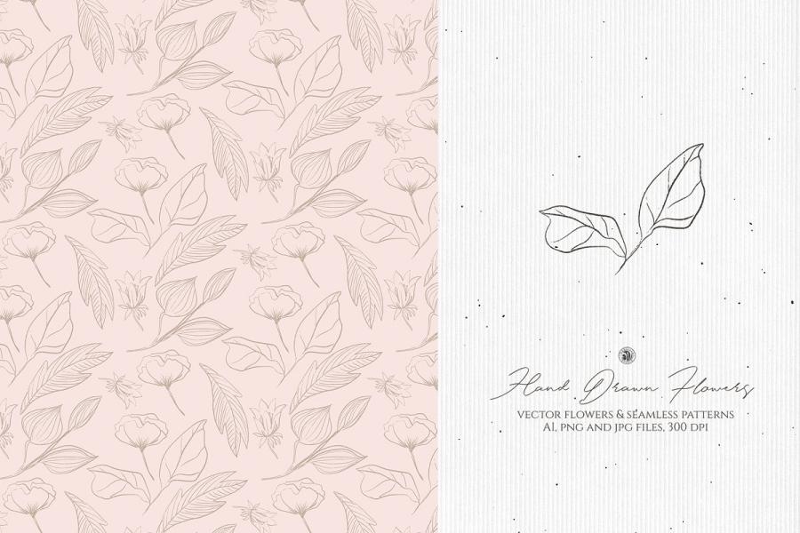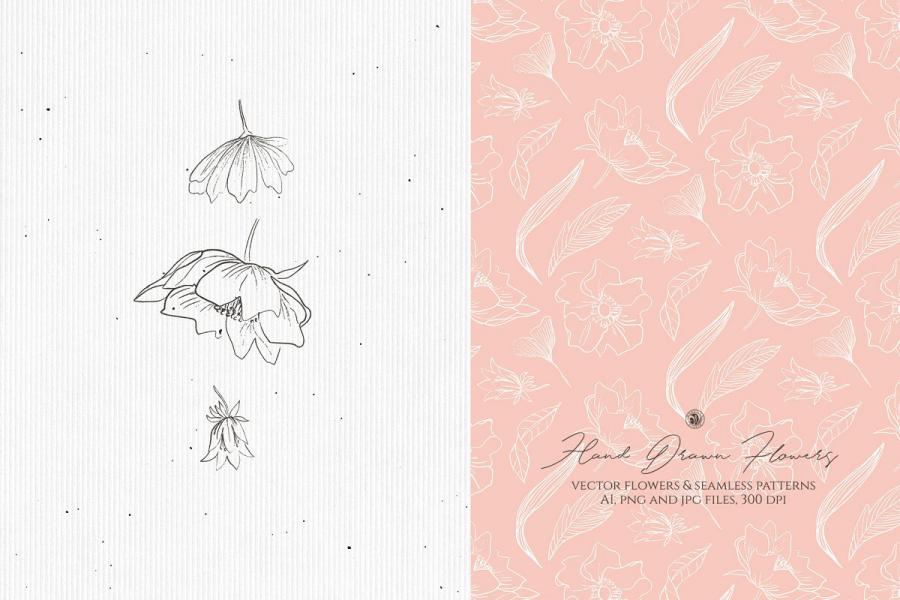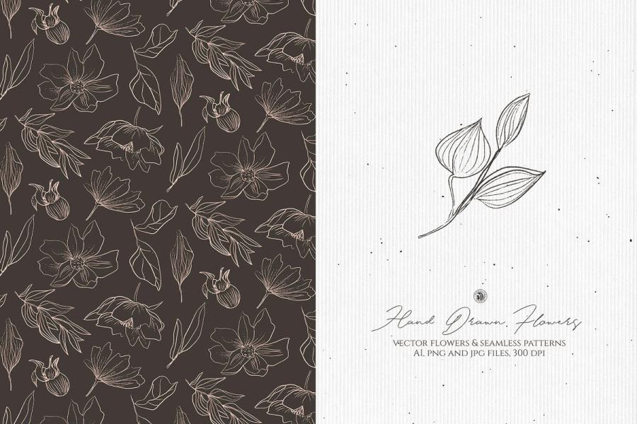 Hand Drawn Flowers – flowers AI and png files and 10 seamless patterns. Ideal hand painted cliparts graphic for DIY projects, invitations, cards, wedding invitations, greeting cards, logos, cases, print design, branding, packaging, posters, wallart, blogs, website, adverstising and more.