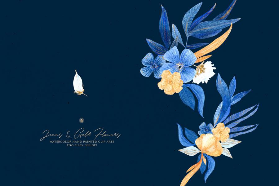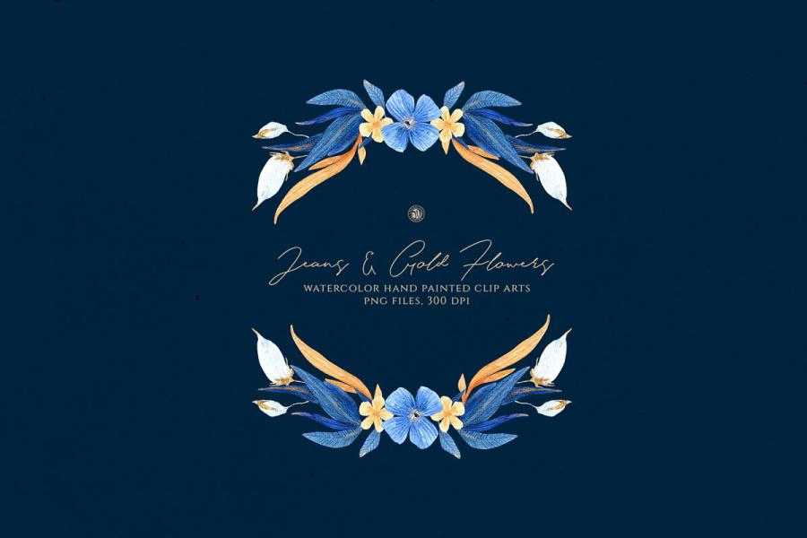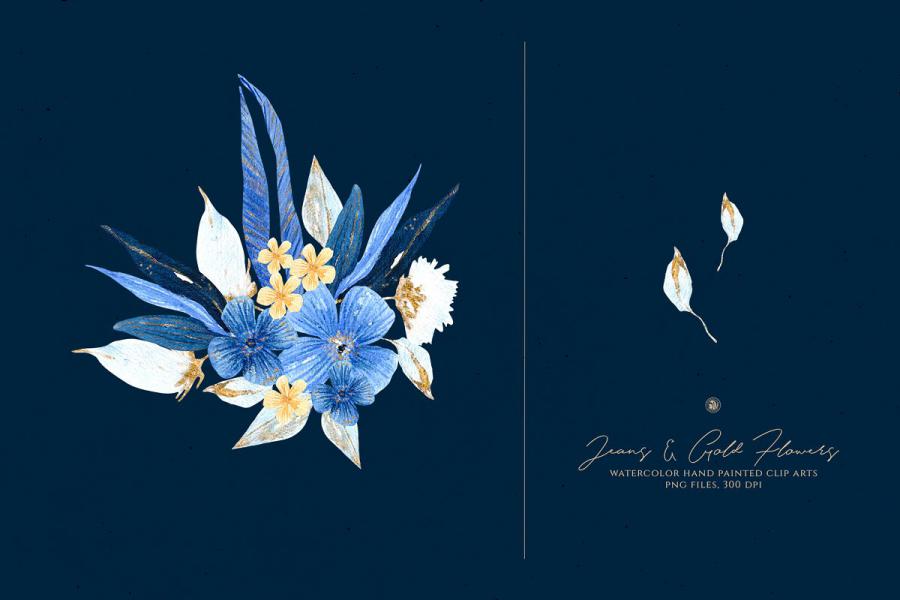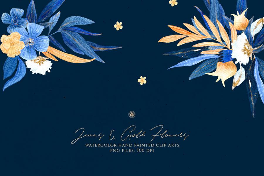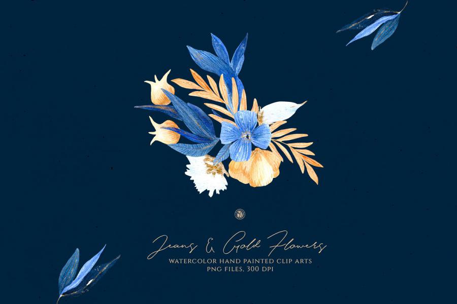 Jeans and Gold Flowers – hand painted watercolor flowers. – Ideal for invitations, business cards, branding, instagram, handmade craft items, scrap booking, printed paper items and more.