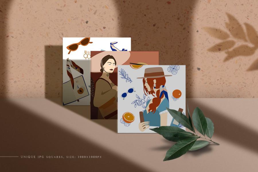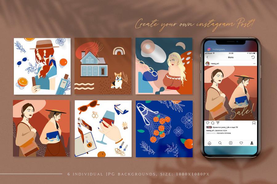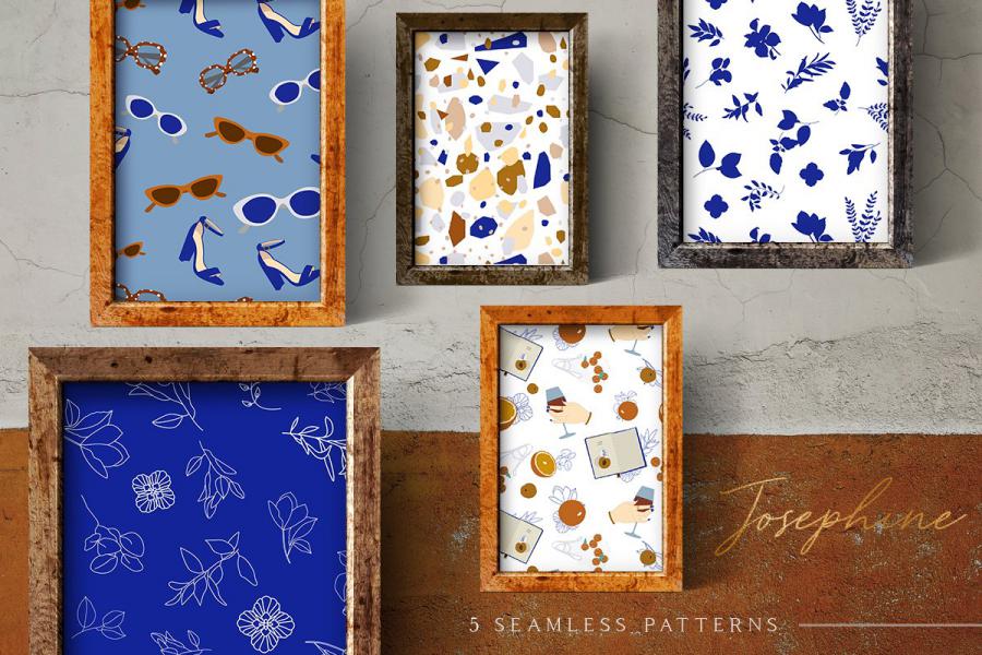 Josephine Collage Set – Create magical branding with this set of colorful abstract shapes and elements that contain pre-made objects, such as: illustrations, seamless patterns, artboards, isolated creative abstract shapes and backgrounds for instagram. Use these elements to create your own unique branding design. You just need to select an element, combine other provided items and сhoose a pattern or background. And branding will be ready! In this pack, you can find a variety of color artboards and patterns. They are available to mix and match for design projects with endless composition combinations of all pieces.