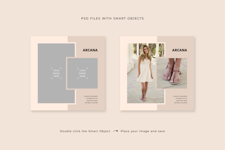 ۲۰ elegant instagram post templates with soft pastel colors for personal or business. Perfect for bloggers, travellers, fashion or lifestyle brands, online shops and etc. You can also use the templates on your blog, facebook and any other social media. Easy to edit, replace images via smart objects, easy to change colors, fonts and text. The pack works correctly only in the program Adobe Photoshop CC or CS.