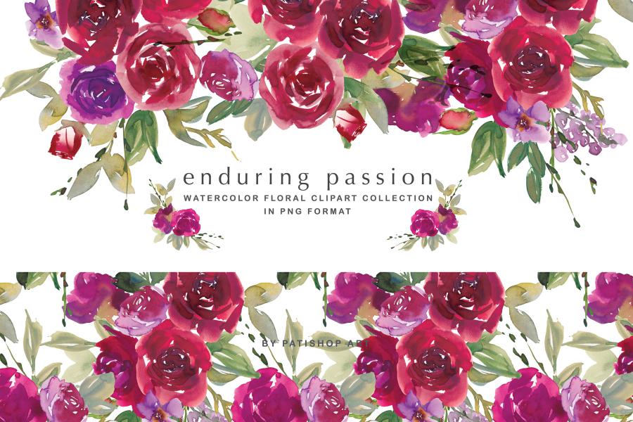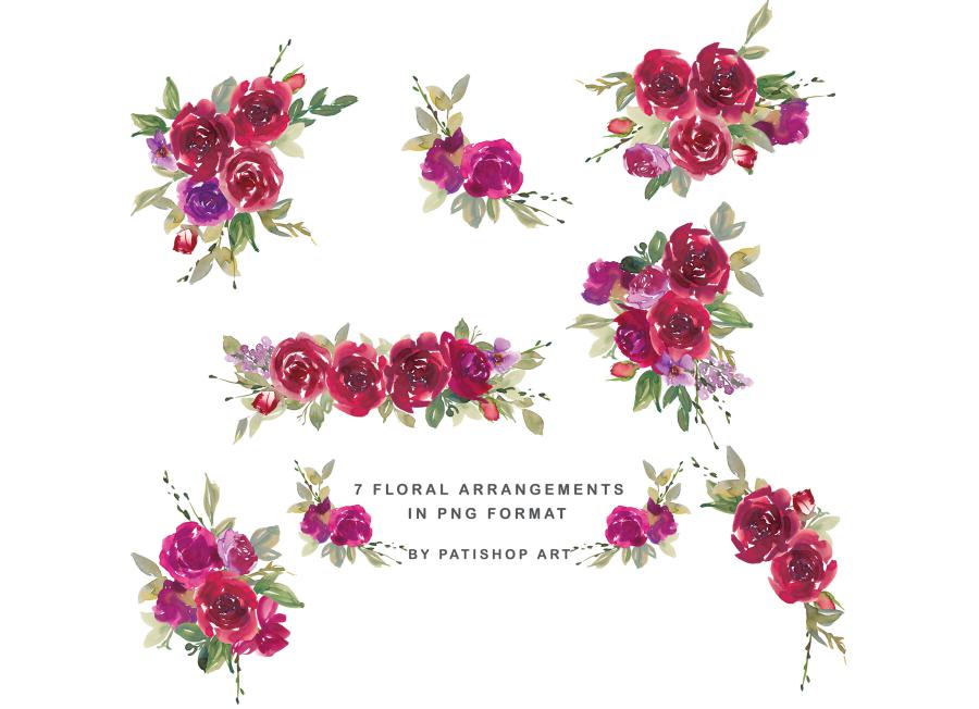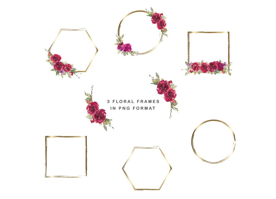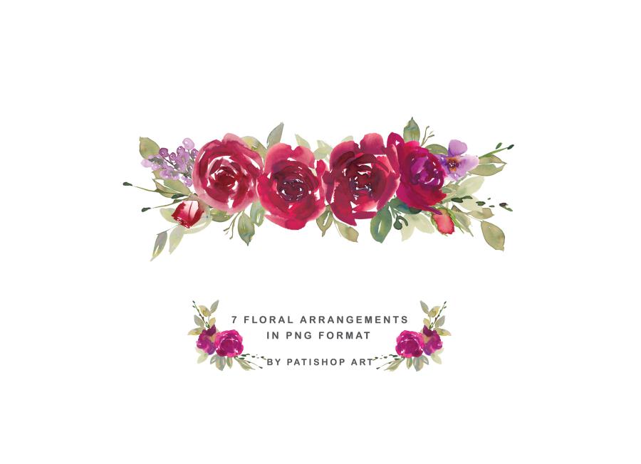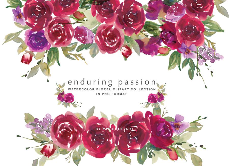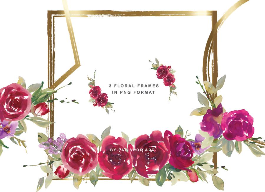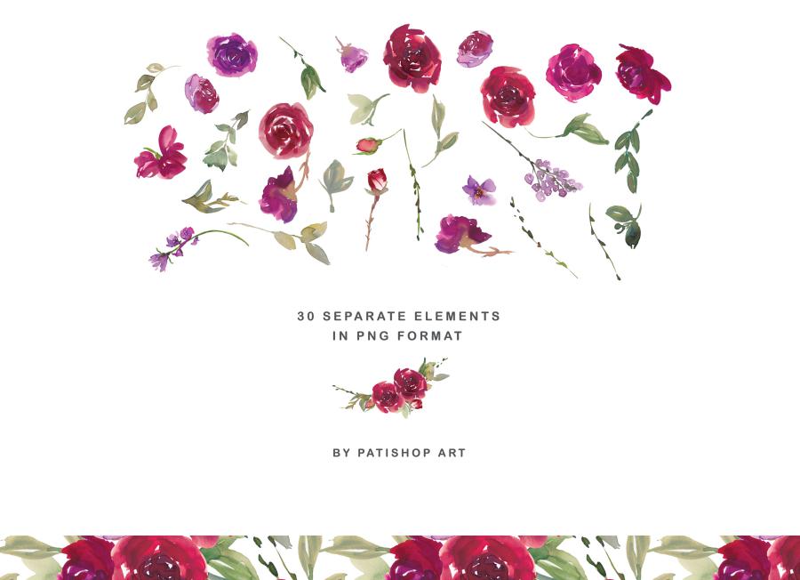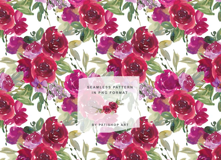 Red and pink watercolor roses clipart collection – floral arrangements, frames, seamless pattern, and individual elements.
