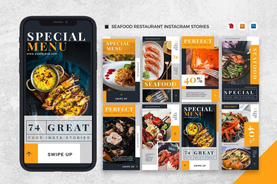 Are you looking for a clean and elegant Seafood Restaurant Instagram stories template to support your marketing campaign? Our Instagram stories template series might be the right option for you 🙂 Editing the content is also easy using Adobe Illustrator and Adobe Photoshop software. We hope you like it!
