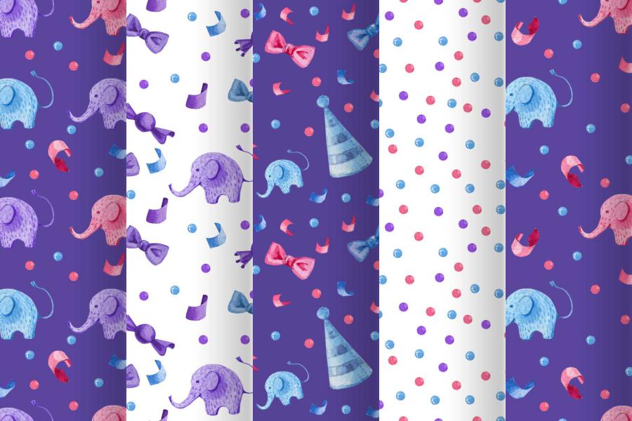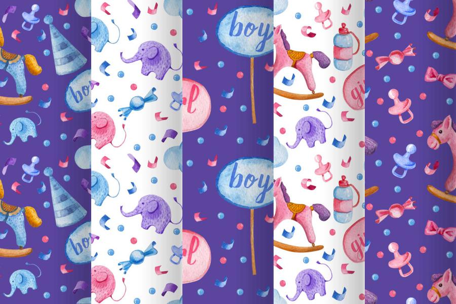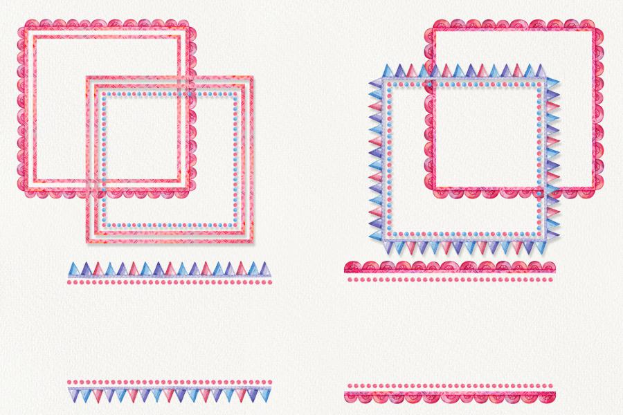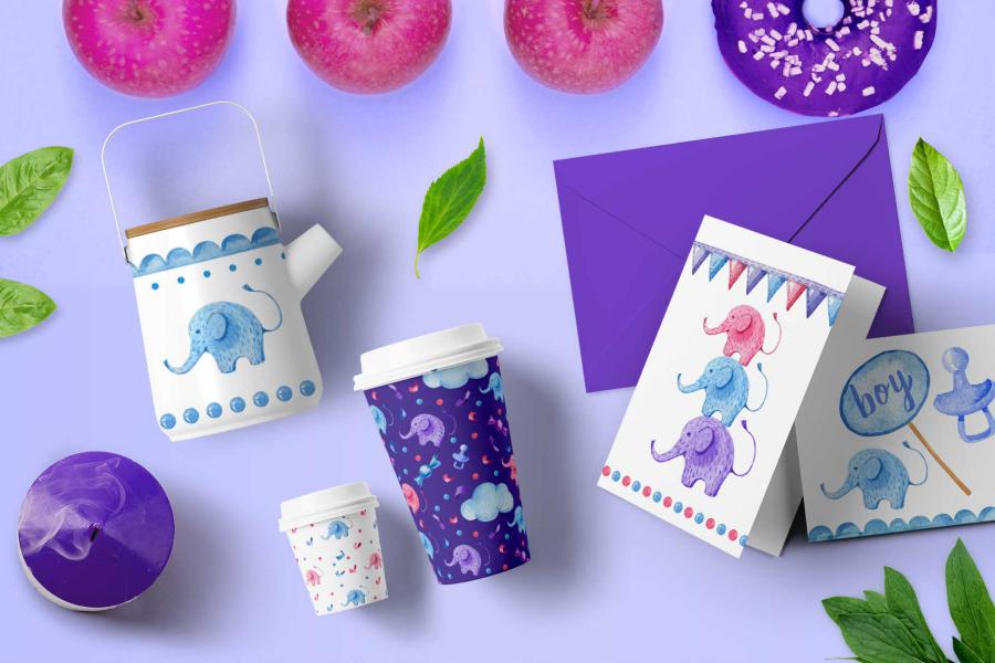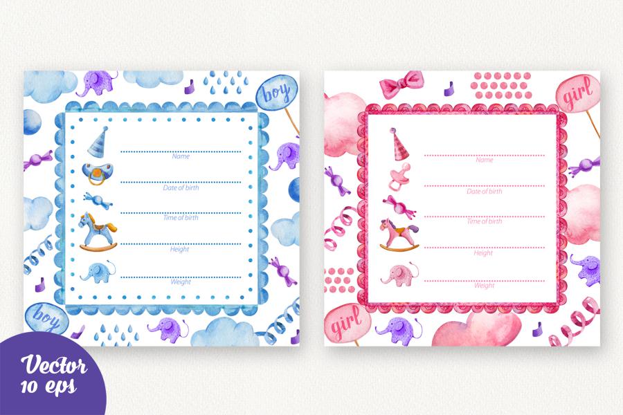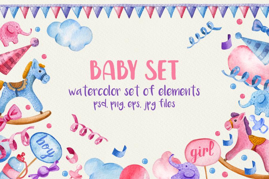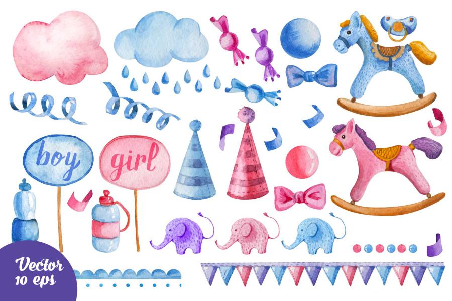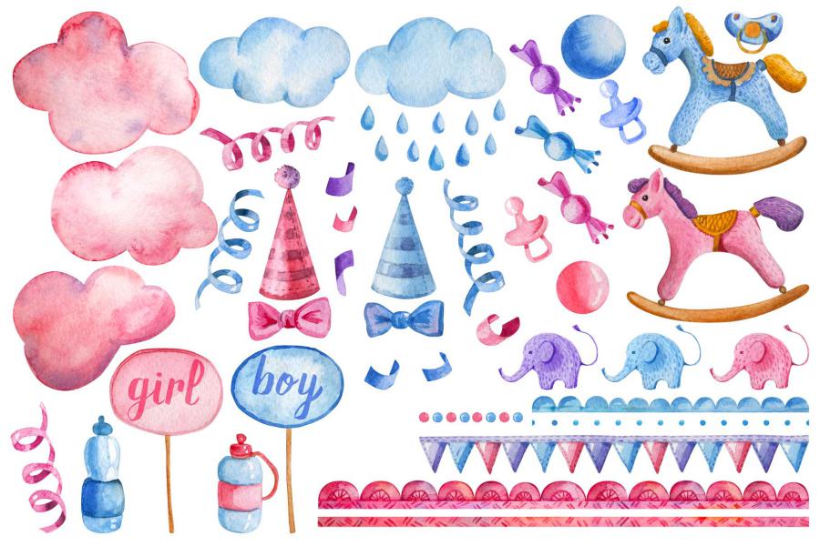 The set includes watercolor elements for the celebration of children’s parties and a baby shower.