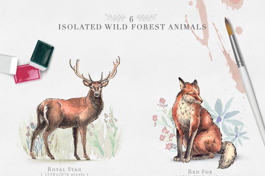 Wild Forest Watercolor Collection – There are 6 different wild unique animals and lots of extra elements such as flower frames and post stamps to make it easy to create designs for your personal or for commercial projects. Floral elements and frames offer endless design solutions, and add a touch of color to your design, they work great on their own, or as an accompaniment to animals!
