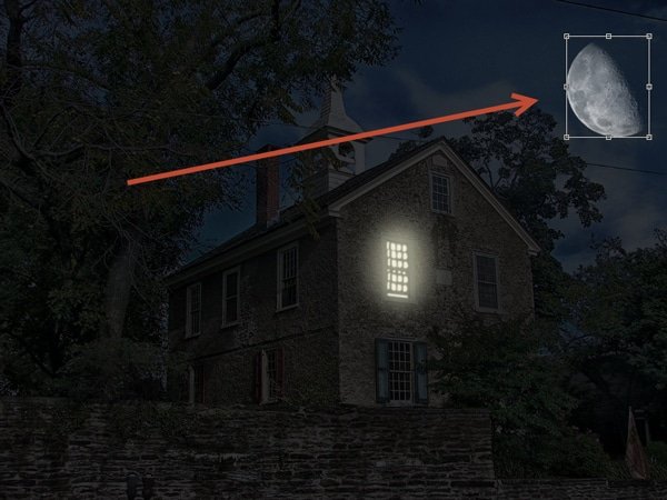 از آنجا که ماه یک منبع نور است باید در تصویر ما منعکس شود . اجازه دهید رنگ برخی از نکات برجسته در عکس را تغییر دهیم . استفاده از یک براش ۱px با رنگ ۵۰٪ opacity و با رنگ سفید در گوشه های سقف و کمی در بالای درختان .